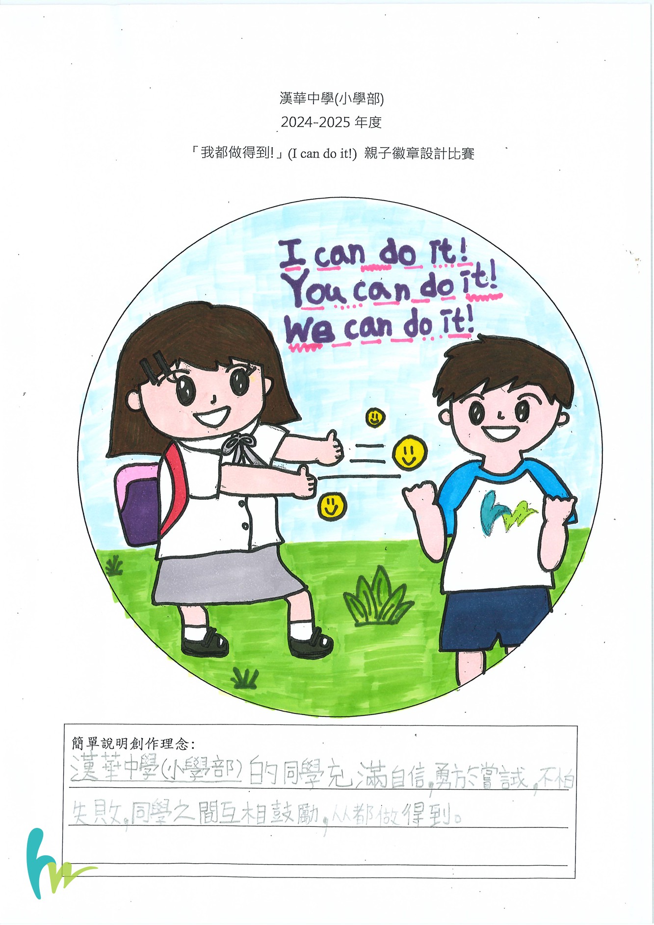 本校本年度主題是「探新求知,樂學體驗」,為了宣揚漢華正能量,建立自信心,舉行了「我都做得到!」You can do it!親子徽章設計比賽。比賽反應十分熱烈。有關比賽結果如下: